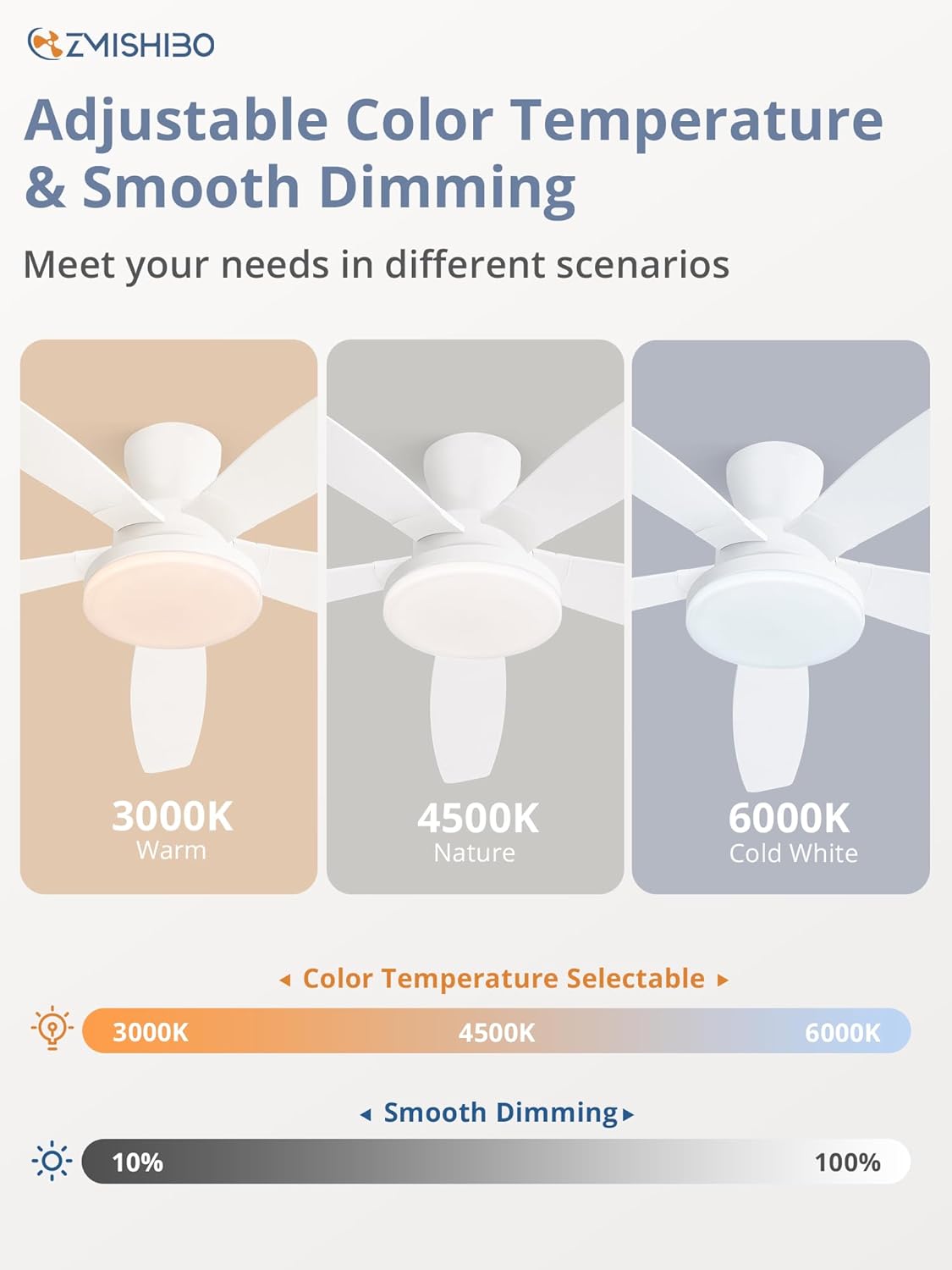 - Customizable light: Our smart ceiling fan can personalize your space with smooth dimming (10%-100%) and 3 adjustable color temperatures (3000K–6000K). The 24W wide LED panel ensures brightness, even illumination perfect for any activity or mood