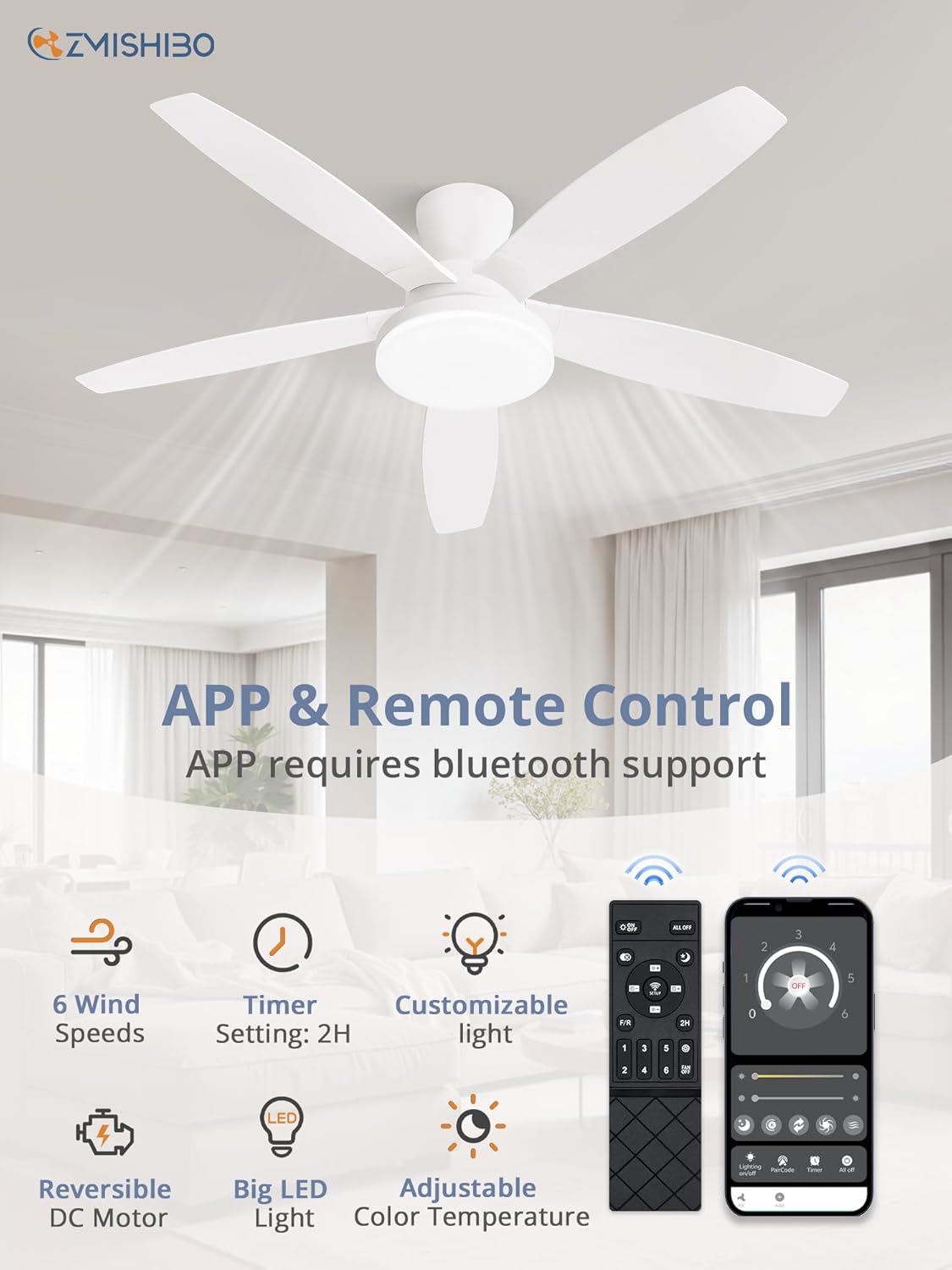 - Ceiling Fans with lights: Our 48 inch ceiling fan has both remote control and APP control. Effortlessly adjust 6-speed settings, dim the light to your preference, or set a convenient 2-hour auto-off timer for energy savings